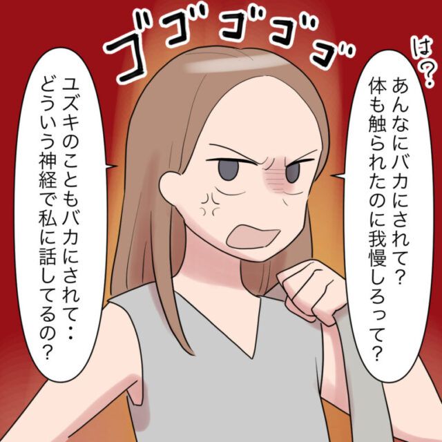 ミノルさんの言葉を聞いて再び怒りが湧いてきたナオミさんです。「はぁ?あんなにバカにされて?体も触られたのに我慢しろって?ユズキのこともバカにされて・・・どういう神経で私に話してるの?」義実家では酔っていたこともあってまともに聞いてもらえなかった不満をもう一度ミノルさんに訴えました。