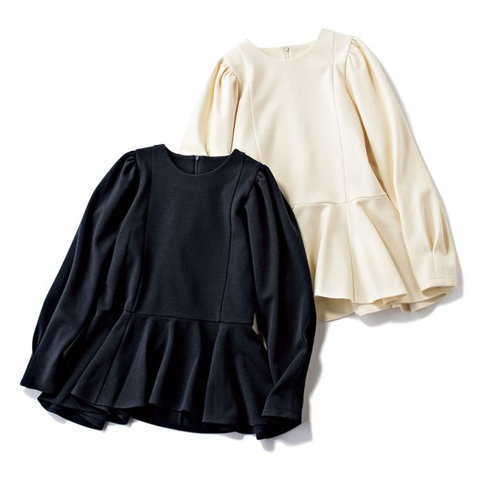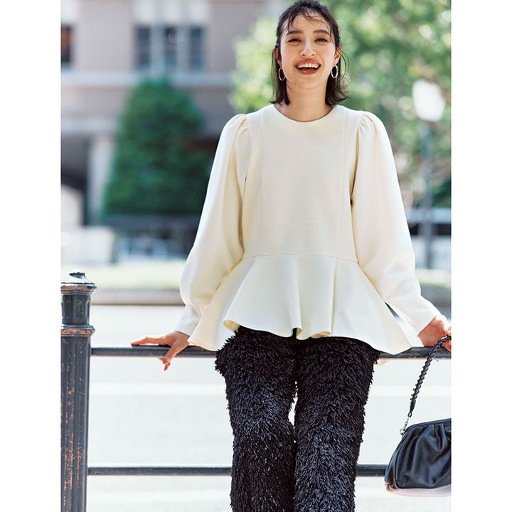 高めの位置で切り替えたペプラムや、ギャザーをたっぷり入れた肩など、楽ちんな着心地なのにエレガントに見える工夫がいっぱい。ゆとりのあるサイジングで、着疲れもなし。コンサバに着るのはもちろん、トレンド感のあるパンツと合わせて、モードカジュアルを楽しむのもおすすめ。