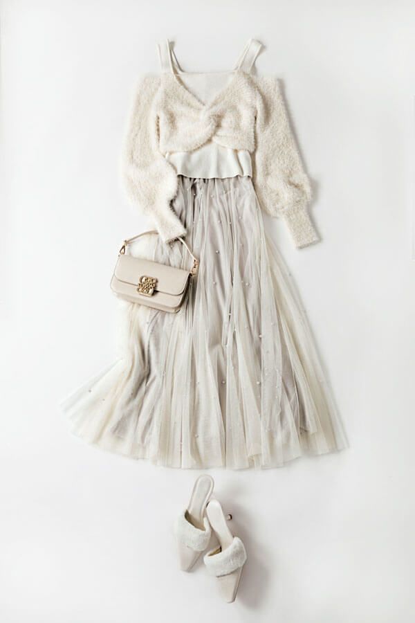 1枚でレイヤード風スタイルを楽しめる、リブタンクにオフショルニットを重ねた技ありデザイン。いつもより盛りたい特別な休日は、パール付きのフレアチュールスカートで華やかにドレスアップして♡