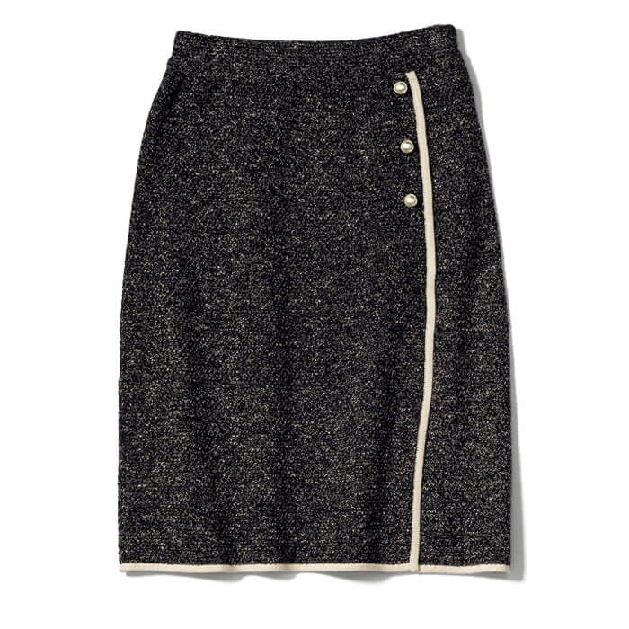 ナローなシルエットや白のパイピングでスカートのクラス感をさらにアップさせて。きれいめなルックスながらもリラックスムードではけるニット素材も魅力的。