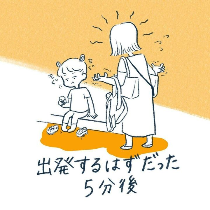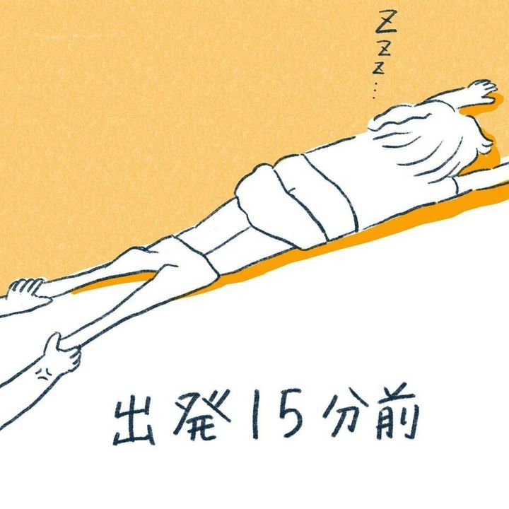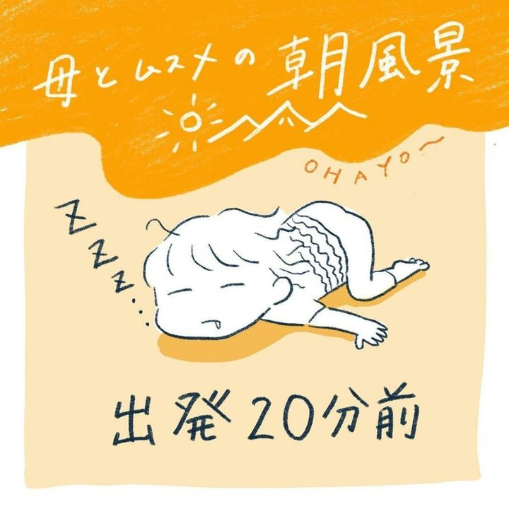 yasuco(@yas_uco)さんの娘は朝、出発の20分前にまだ寝ているよう。それは出発の10分前になっても変わらず、ご飯やトイレを済ませ、やっと出発予定の15分後に家を出ることができますが…?