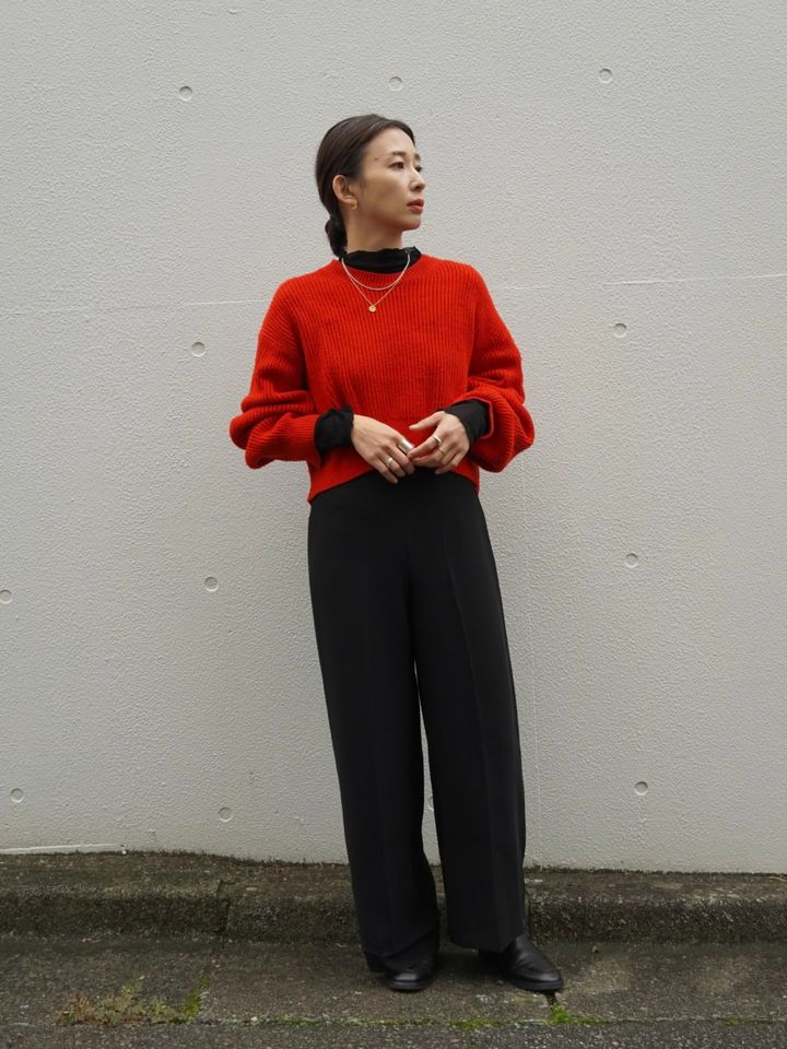 「ブラックを基調に、赤いニットを合わせてメリハリのあるコーディネートに。2色のみのスタイリングですが、赤を入れることでパッと明るい印象的に。首元や手首からインナーをチラリと見せたり、アクセサリーでアクセントを入れています」