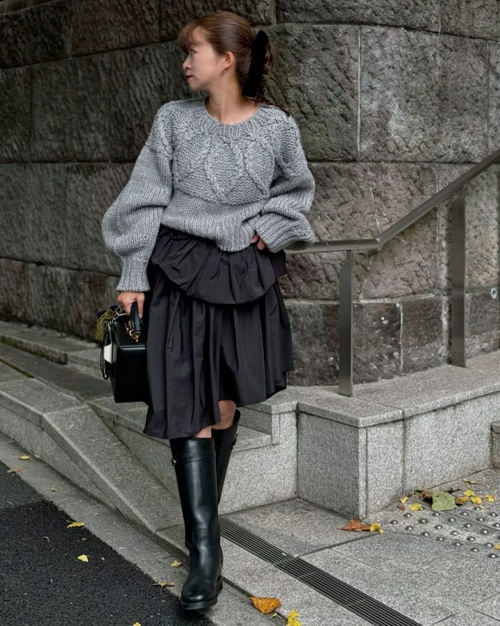 「手編みのケーブルニットを主役に、レディなムードでコーディネートをしました。ボトムは、ボリュームのあるニットとバランスよく着られるア ヴァケーションのナイロンスカートをチョイス。モノトーンでまとめることで、シックなムードを演出しました」