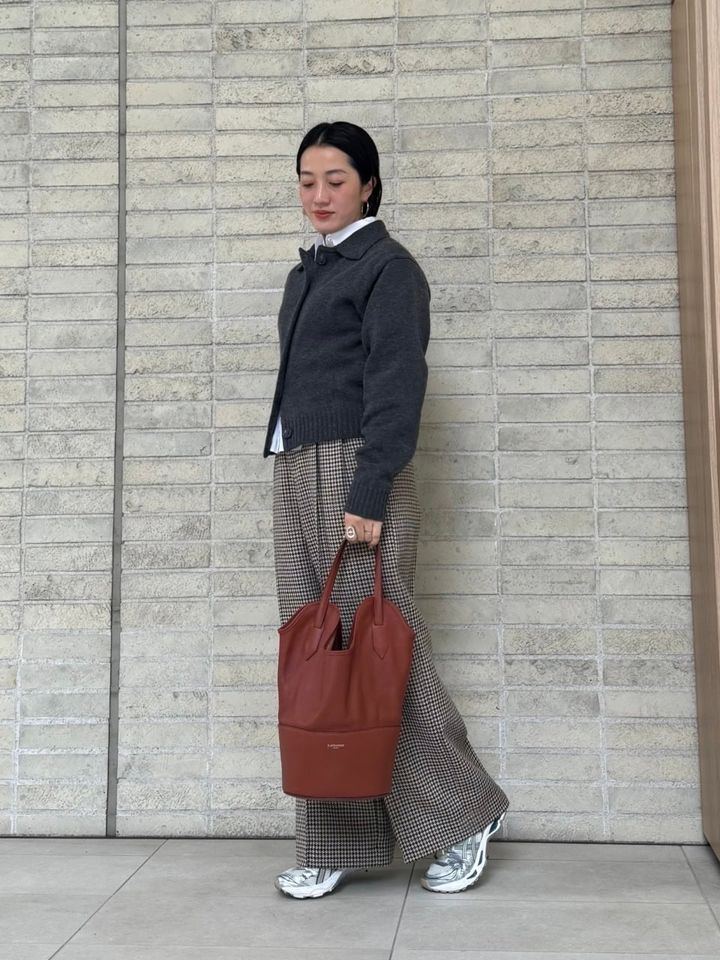 「白シャツにコンパクトな襟付きニットを重ねたプレッピースタイルに、ハウンドトゥース柄のおじさんぽいワイドパンツを合わせ、テラコッタカラーのバッグを差し色にした晩秋スタイル。足元は軽さを出すために、あえてスニーカーを選びました」