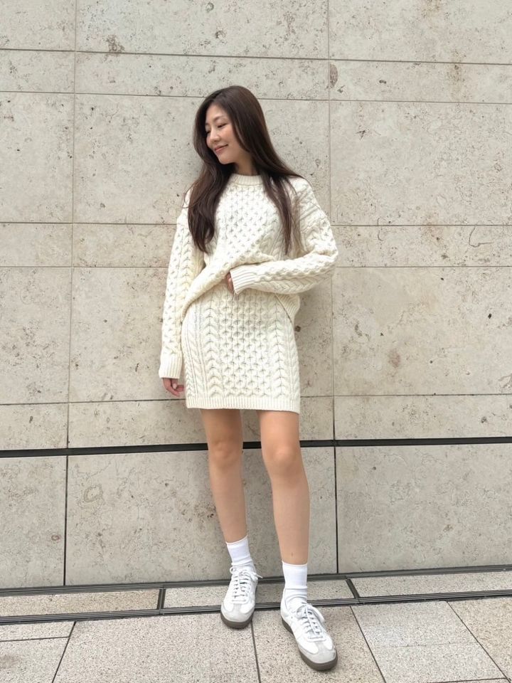 「可愛らしいニットセットアップを大人っぽくカジュアルに♡ アランケーブル柄がレトロで可愛いニットのスカートとセットアップになっています。ボリュームがあって女性らしいニットなので、甘くなりすぎないようあえてスニーカーではずしました」
