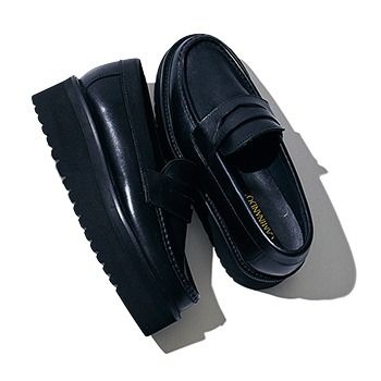 黒コインローファー(5)/CAMINANDO(グラビテート) ムダのない硬派なアッパーが大胆な厚底を大人っぽく。ブランドこだわりの軽量ソールもポイント。