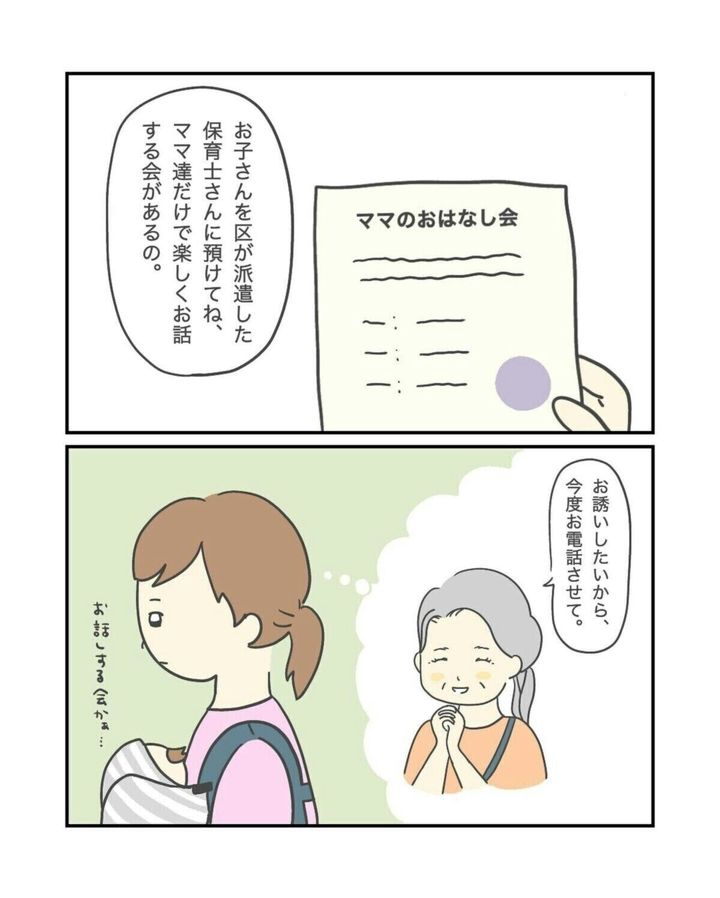 ぽぽ。さんんは保健師さんから、ママ同士のおはなし会のお誘いを受けます。各自治体により取り組みはさまざまですが、こういった交流会があると同じような悩みを話しあったり自分の時間を持ててよいですよね。他にも、一時保育制度など、子どもを預かってくれる制度はあります。そういったものを利用して休息にあてたり、自分のリフレッシュする時間を作ることもよいかもしれません。