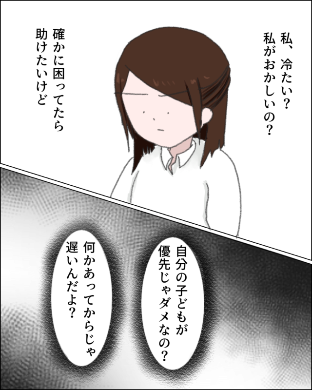私って冷たいのかな。私がおかしいの?人が困っていたらそりゃ助けたいけど。ひとりで長時間お腹を空かせて親の帰りを待っていたユリの顔を思い出すと、やっぱり腹が立ちました。何かあってからでは遅いのだから。