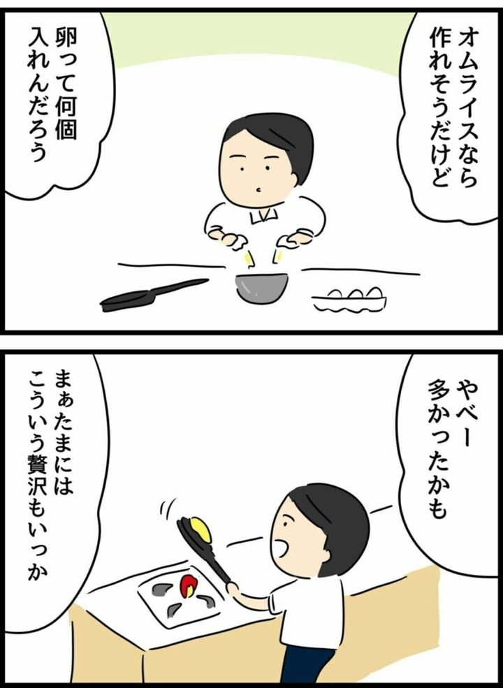 夫・エスオは、疲れて帰ってくる妻のためにご飯を作ってあげることにしたようです。卵の量は雰囲気のようですが、妻のため気持ちを込めて作っているのが伝わりますね。