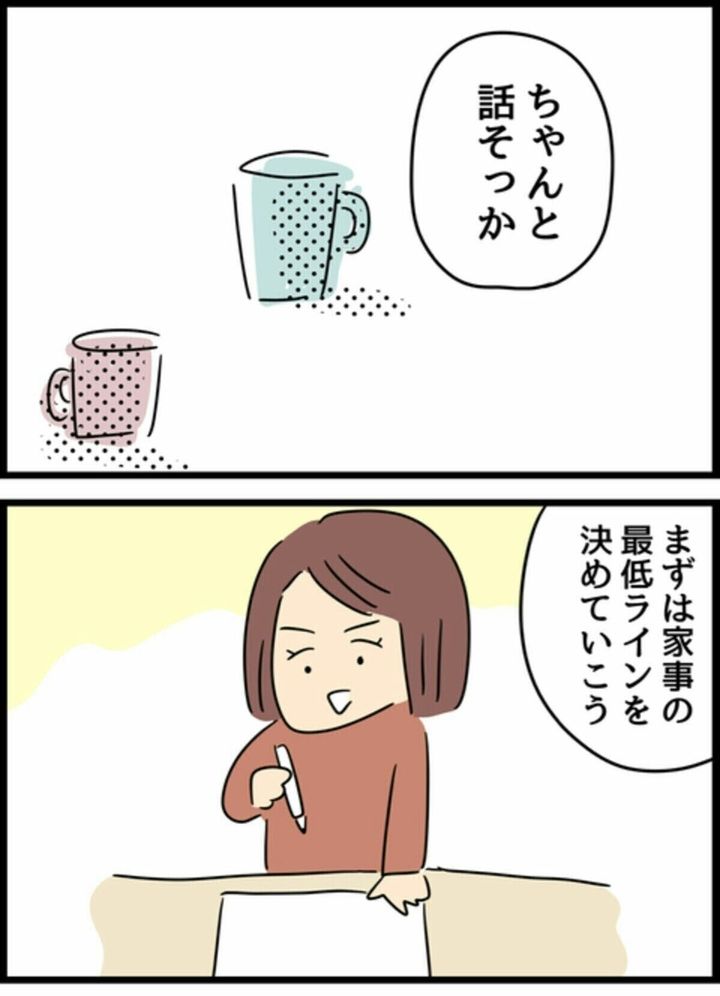 しかし、2人はこの後少しずつ、すれ違います。お互いの家事の最低ラインがずれているために、不満がたまってしまったのです。