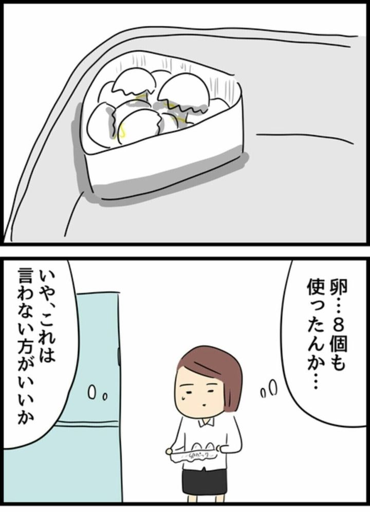 しかし、オムライスが用意されていることに気がつき、一気にうれしくなります。誰でも帰宅してご飯の用意がされていたらうれしくなりますよね。しかし喜んだのもつかの間…。なんと卵が8個も使われた形跡が…。言うに言えず、素直に喜べない妻エムコ。