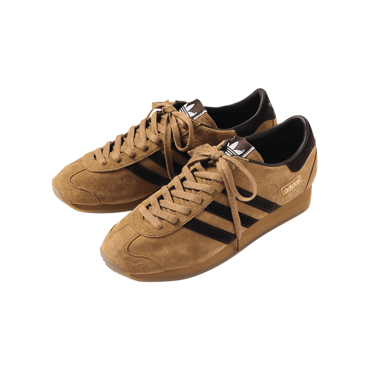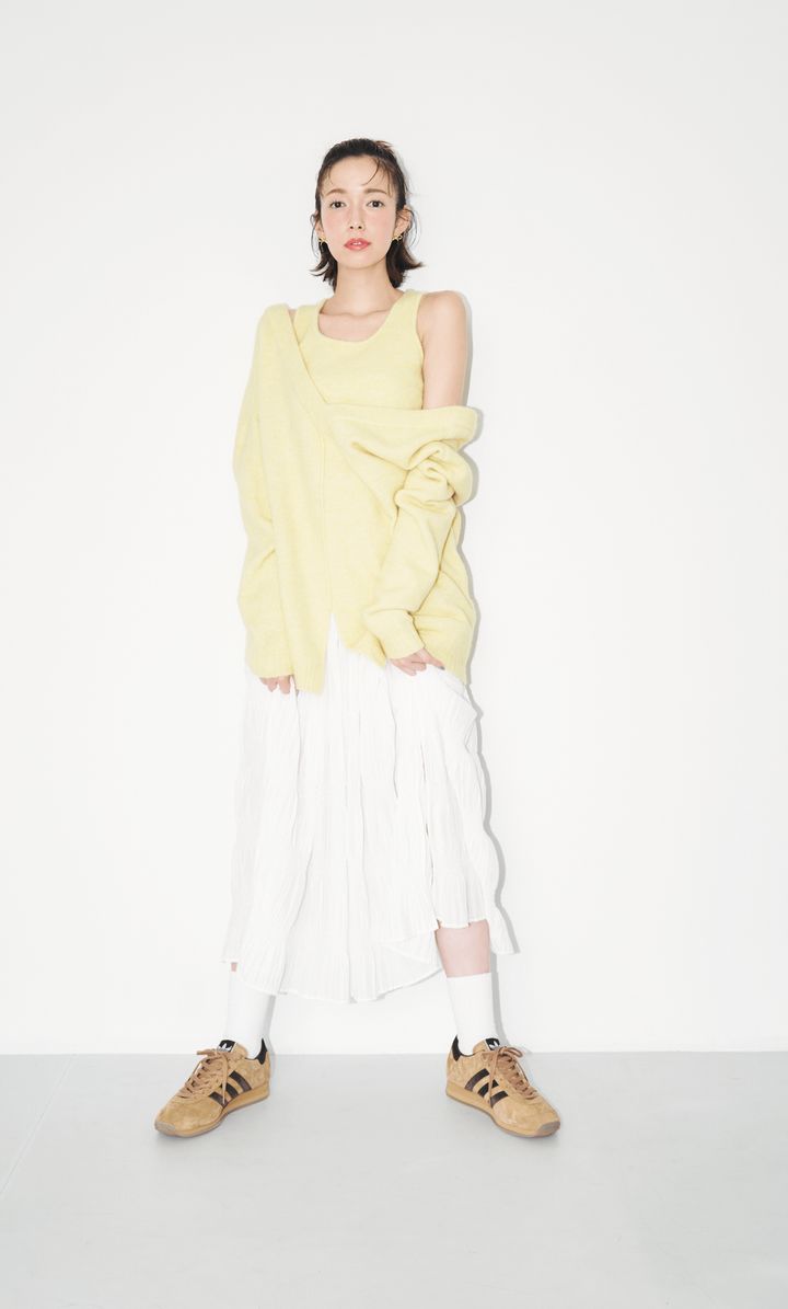 白のフレアスカートに、今季注目のひよこイエローのニット。足元にあえてレトロなスニーカーを合わせることで、オシャレ度がグッと高まる! コチラはアディダス オリジナルスのカントリーというモデル。