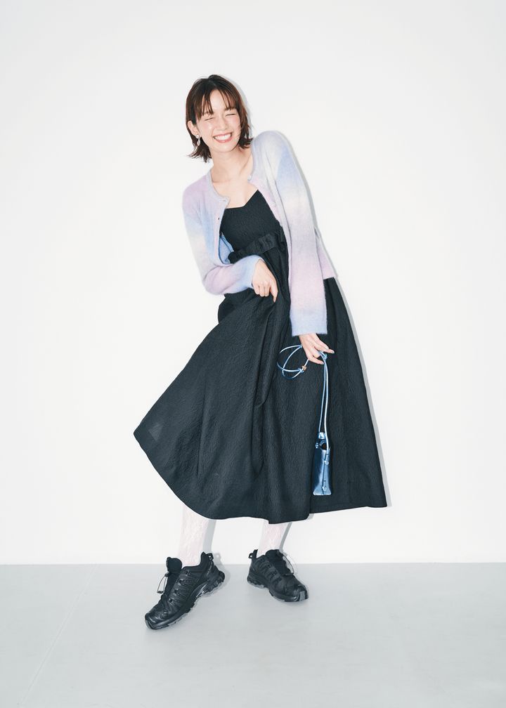 大人気のサロモンは、ブーツ感覚で履けるオールブラックが秋に大活躍。甘ーいドレスとキレイ色カーデの組み合わせにこなれ感をプラス。ドレスと足元の黒を合わせて、統一感を意識するのもコツ。
