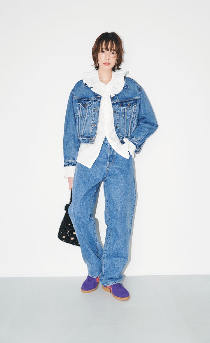 佐藤栞里。ar10月号より スニーカー¥14,300/アシックス(アシックスジャパン カスタマーサポート部) ジャケット¥28,600/リーバイス®(リーバイストラウス ジャパン) パンツ¥15,180/マウジー(バロックジャパンリミテッド) ブラウス¥28,600/ビリティス・ディセッタン(ビリティス) ピアス¥13,200/ビジュー アール・アイ バッグ¥19,000/オープン セサミ クラブ