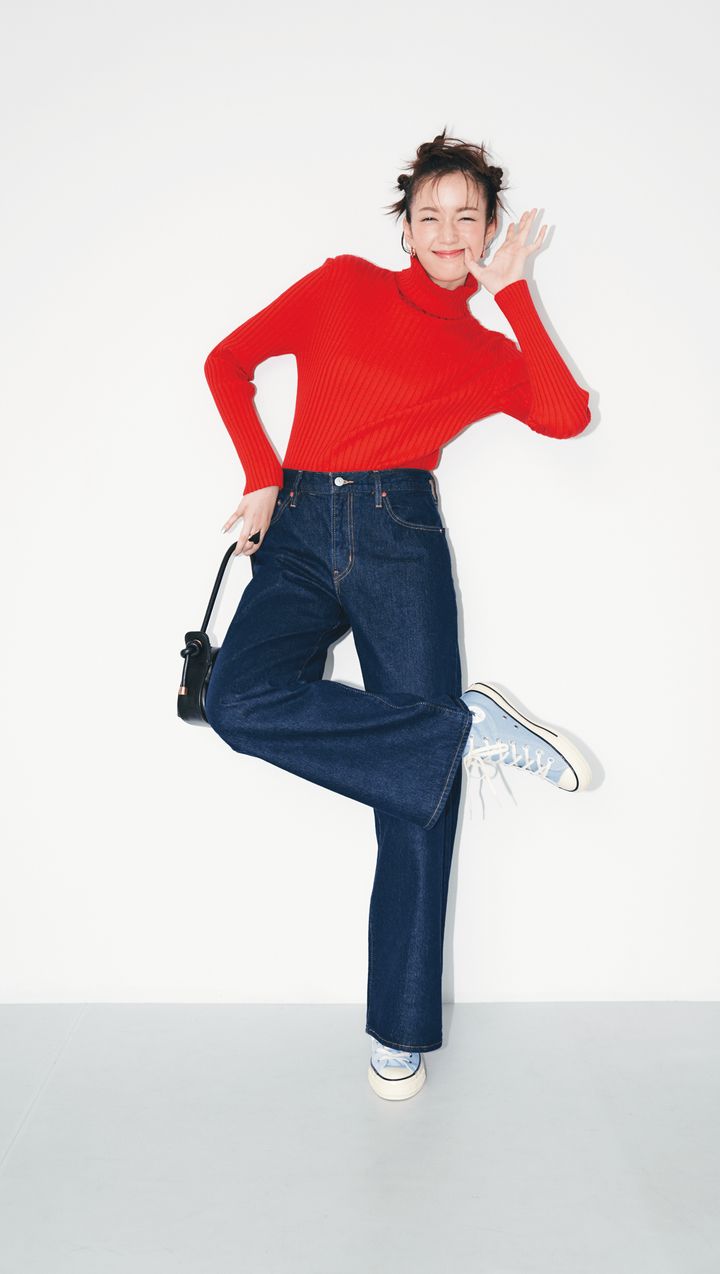 佐藤栞里。ar10月号より スニーカー¥9,350/コンバース(コンバースインフォメーションセンター) デニムパンツ¥14,300/リーバイス®(リーバイ・ストラウス ジャパン) ニット¥25,300/アモーメント ピアス¥3,080/アネモネ(サンポークリエイト) リング¥12,100/ビジュー アール・アイ バッグ¥26,000/ブリー レオン(ジャック・オブ・オール・トレーズ プレスルーム)