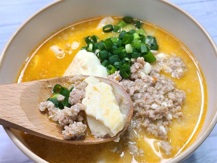 メインの食材はひき肉と豆腐だけ、というシンプルさがいいですよね。家庭にある調味料だけでこれだけコクのあるスープが作れるなんて驚きでした。お店の味です!ポイントは豆板醤をしっかりと炒めること。お肉と合わせたときにしっかりと炒めることで、旨味が出るそうです。旨味がしっかり出ているせいか、具材がひき肉と豆腐だけなのに思っていた以上に満足感が高かったです。さらにボリュームが欲しい人は、きのこやもやしなどを入れてもおいしいと思います!そうするとスープだけでお腹いっぱいになれちゃいますね♡わが家では、最後にご飯を入れて食べました♡