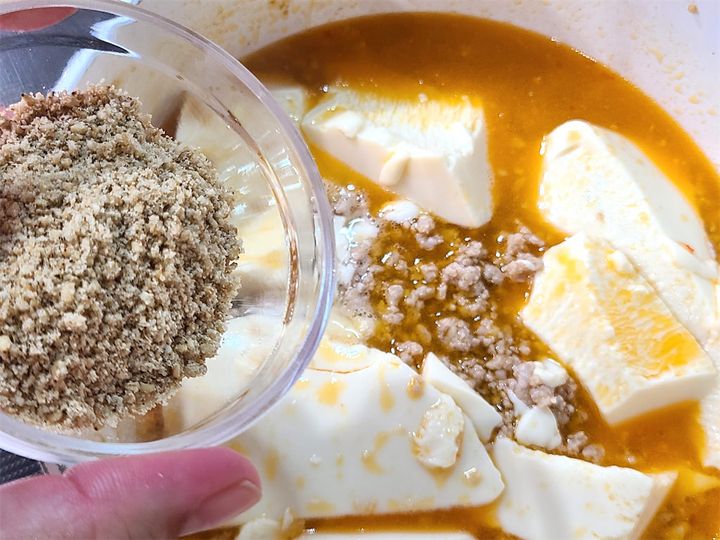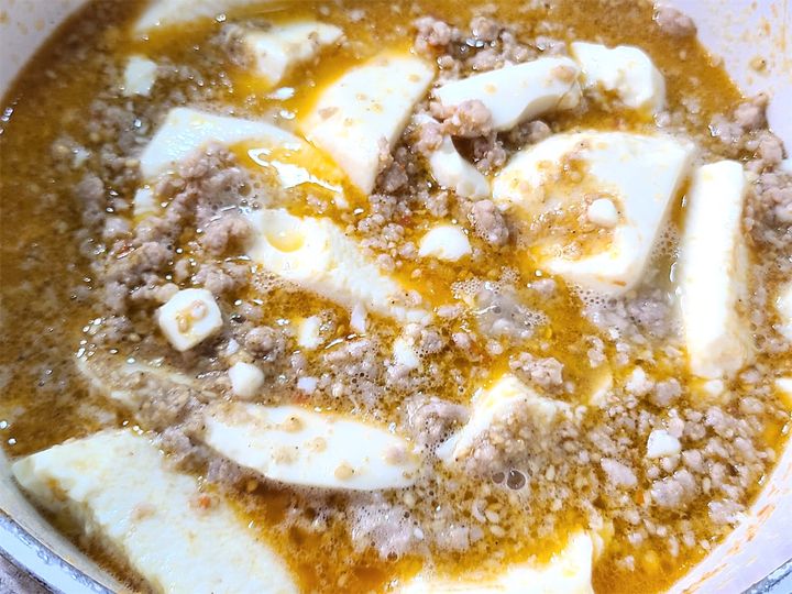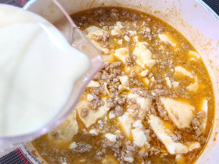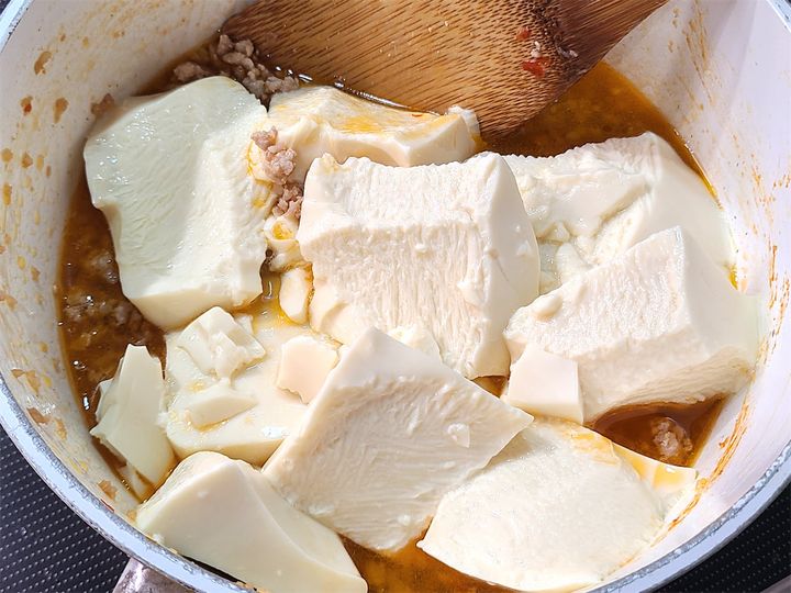 3. ひき肉にしっかり火が通ったら水を入れ、スプーンなどで大きめにとった豆腐を入れます。