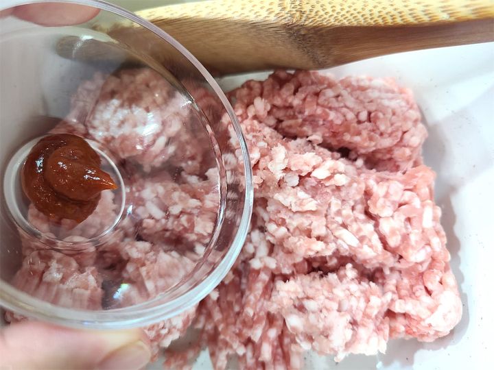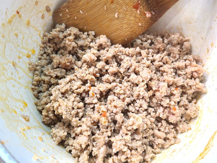 2. フッ素樹脂加工の鍋に油を引かずひき肉を入れ、しょうが、にんにく、豆板醤を加え中火で炒めます。