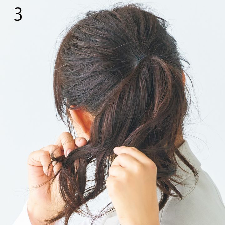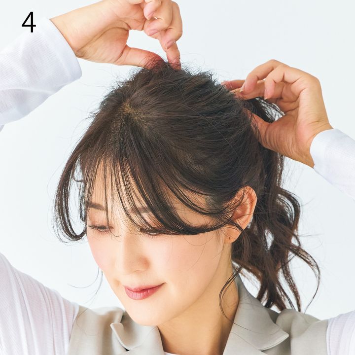 結んだ根元を両手でつかみ、軽く上に引き上げてから左右に広げます。根元が上向きになり、毛束全体がふんわりします。