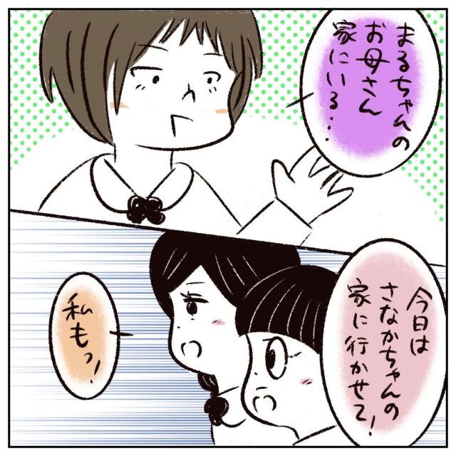さなかちゃんが「まるちゃんのお母さん家にいる・・・」と言おうとすると、まるさんが「今日はさなかちゃんの家に行かせて!」と言いました。