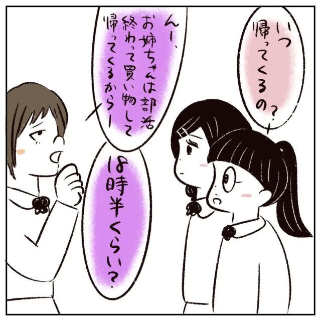 まるさんが「いつ帰ってくるの?」と聞くと「んー、お姉ちゃんは部活終わって買い物して帰ってくるからー18時半くらい?」