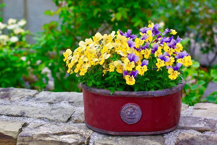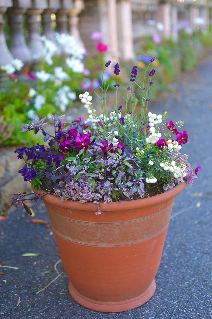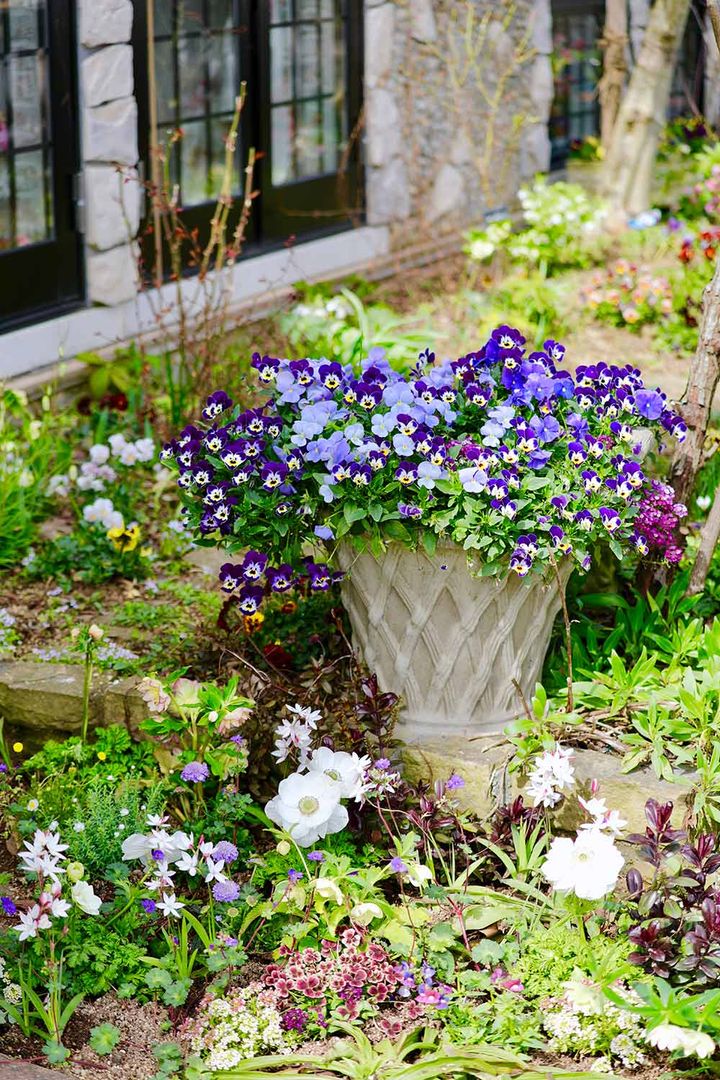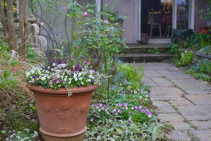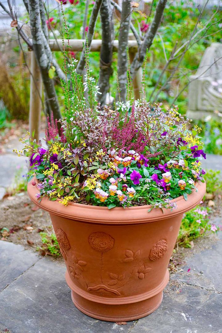 庭の小道の入り口に置いた中鉢の寄せ植えです。周りにいろいろな花が咲く場所なので、寄せ植えはパンジー&ビオラに絞って印象的にしました。例えば、複数の寄せ植えの鉢を並べる場合も、シンプルな鉢植えと複数種類の植物が入った複雑な寄せ植えを組み合わせると、見応えのある風景になります。