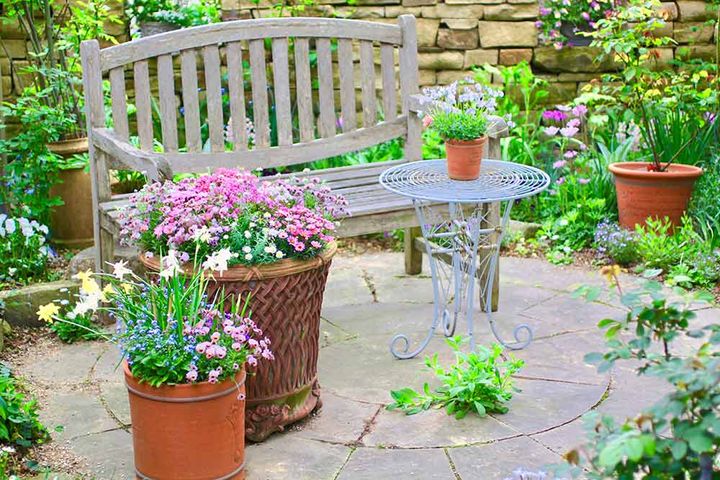 大鉢、中鉢、小鉢を並べた庭のテラスです。大鉢と中鉢のパンジーは同じものを入れてコーディネートしました。寄せ植えはなんといっても地植えにできない場所でも華やかに演出できるのがメリット。さまざまなサイズの寄せ植えを作って家の周りを彩ってみてはいかがでしょうか。