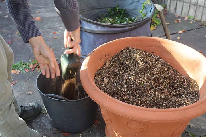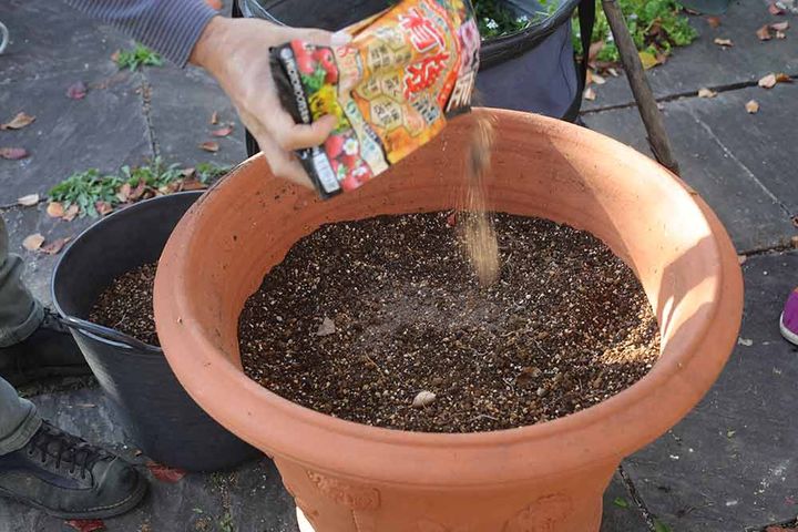 次の植物がよく育つように元肥を入れ、その上から新しい用土を鉢縁から10cm程度下くらいまでになるようたします。