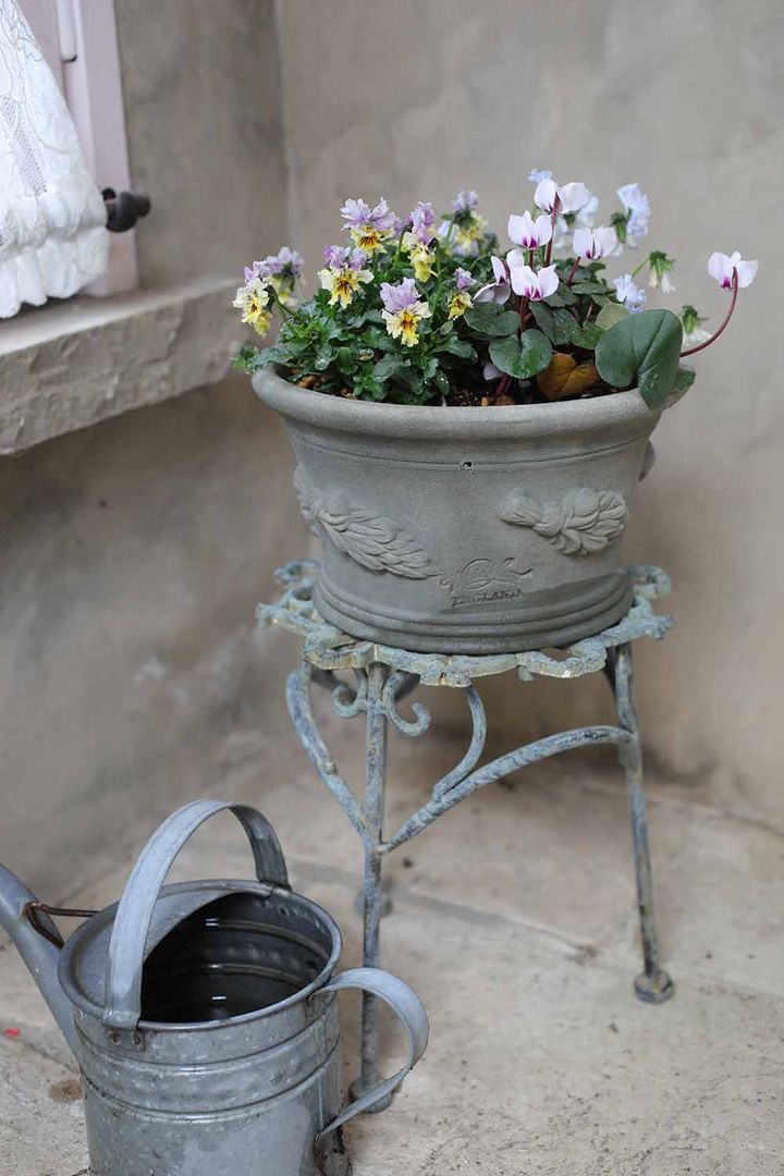 パンジー&ビオラは一輪で複雑な表情を持つ絞りやフリル、フリンジなど、工芸品のような花があります。入手するのも困難な品種も少なくありませんが、運よくそんなレア品種と出会えたときには小鉢でコレクション的に楽しみます。ガーデンテーブルや門柱の上に置けるサイズ感なので、風景のワンポイントになります。