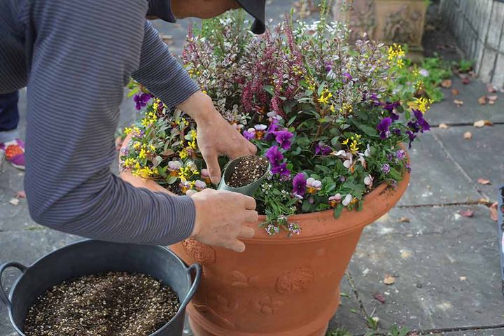 根元に十分水がいき渡るように水やりをして完了。鉢底から水が流れ出るまでたっぷりあげましょう。冬の間はあまり花が咲き進みませんが、花がらを見つけたら摘み取りましょう。定期的に液肥を与えると寄せ植えの見頃が長くなります。