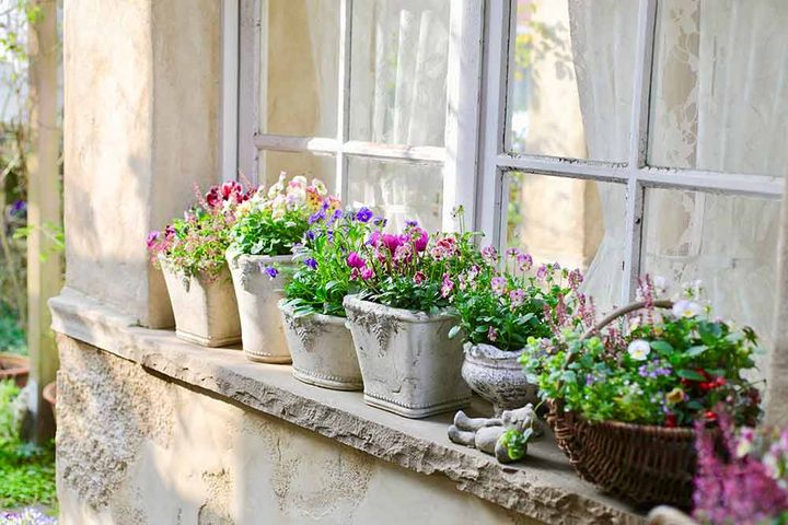 1鉢に1種ずつ植えた小鉢を並べてコーディネートした寄せ植えならぬ「寄せ鉢」の窓辺です。小鉢を複数並べる場合は鉢の素材感や色を合わせると花が引き立ちスッキリ見えます。パンジー&ビオラは品種数がとても幅広いので、1鉢ずつ異なる品種を植えた寄せ鉢もおすすめです。