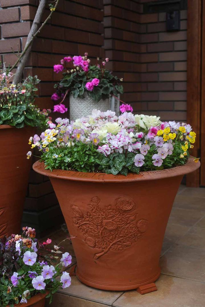 大鉢は玄関前や庭の入り口などに、格式を演出する存在感があります。この鉢で使っているのはパンジー&ビオラ、ガーデンシクラメン、ハボタン の3種類の代表的な冬の素材で、一つひとつはそれほど主張の強い花ではありませんが、大鉢1つにまとめることで華やかさを演出することができます。小鉢に分散させることもできますが、鉢の色や素材感の異なるものをたくさん並べると、ごちゃごちゃした印象になってしまいがち。鉢をたくさん置く場合には鉢の色が素材感も考えた方がよいです。その点、大鉢1つは手軽に印象的な風景が作れます。