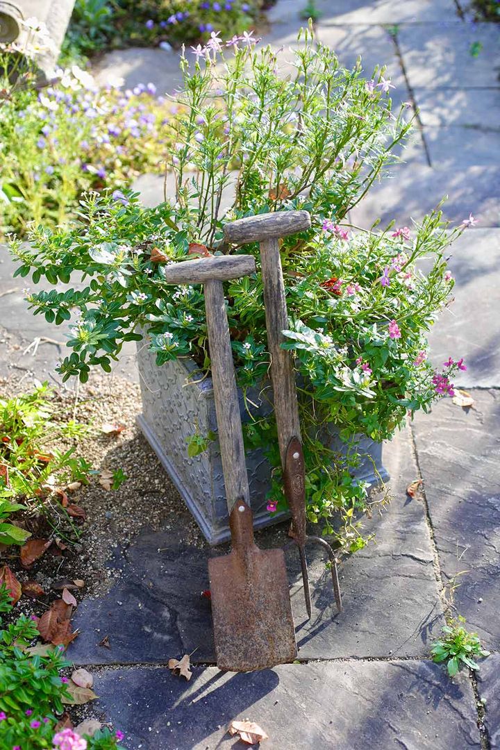 大鉢に土が入り植物を植えると、とても重くなるので、基本的に移動できません。日当たりなどを考慮して置く場所や鉢を吟味して置く必要があります。そして、何を植えるか植物選びもポイントです。鉢の容量が大きいのでバラや大型の宿根草ももちろん育てられますが、こうした花々は見頃が短期間のことが多いです。玄関前など目立つところに置いた場合、花期以外は見所が少ない鉢になってしまいます。ですから、私は季節ごとに植え替えることを前提とし、一年草を主役にしています。一年草は1シーズン限りですが、一緒に植えた低木や宿根草は庭におろして再利用もできます。株数はトータルで20〜30株植え込みます。