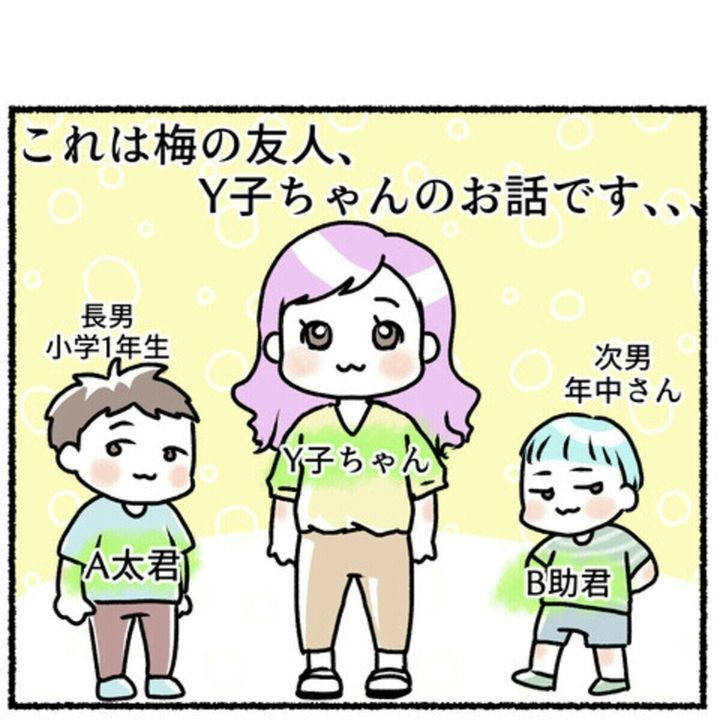 このお話は梅(佐伯梅)さんの友人Y子ちゃんの体験を基に描かれたエピソードです。Y子ちゃんは2児のママです。次男のB助くんは幼稚園の年中さん。