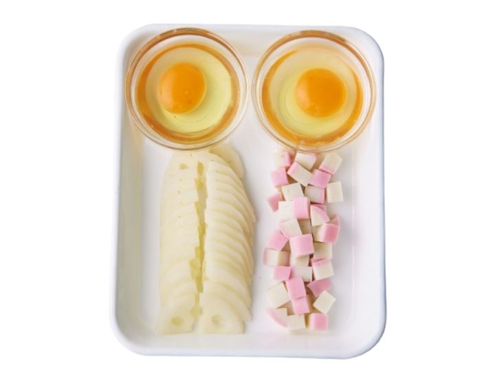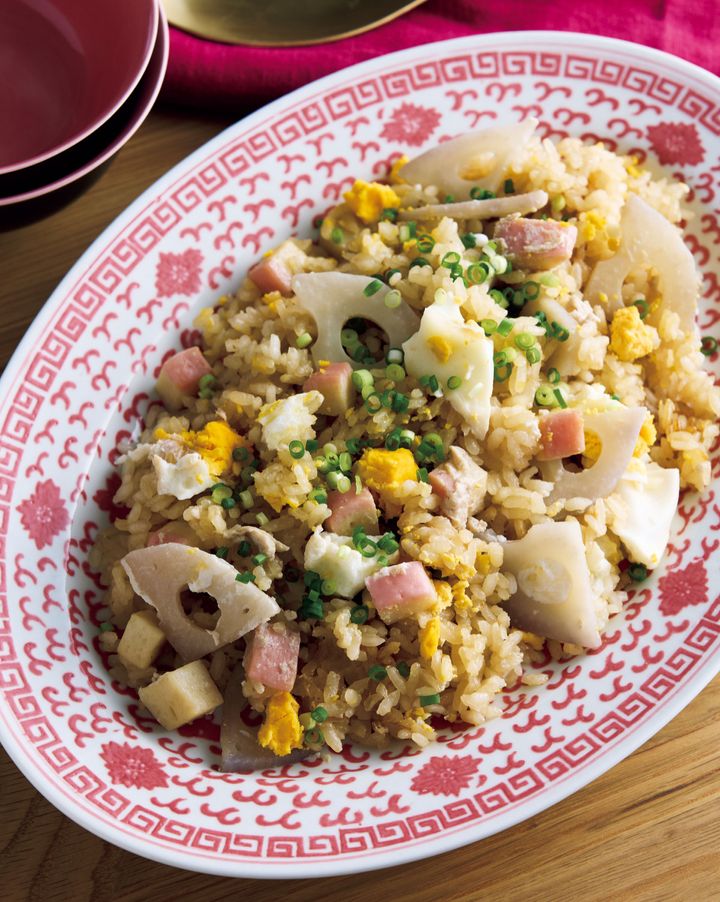 (2)炊飯器の内がまに米を入れ、中華風のたれを加えて2合の目盛りまで水を注ぎ、よく混ぜる。れんこん、かまぼこを順に広げ入れ、卵を間隔をあけてそっと落とし入れて普通に炊く。炊き上がったら、卵をほぐしながら全体を混ぜて器に盛り、万能ねぎを散らす。
