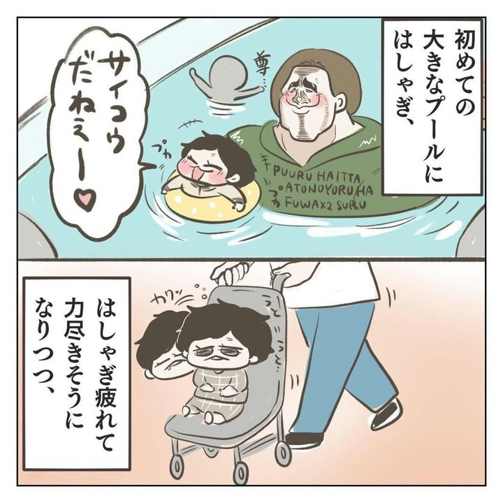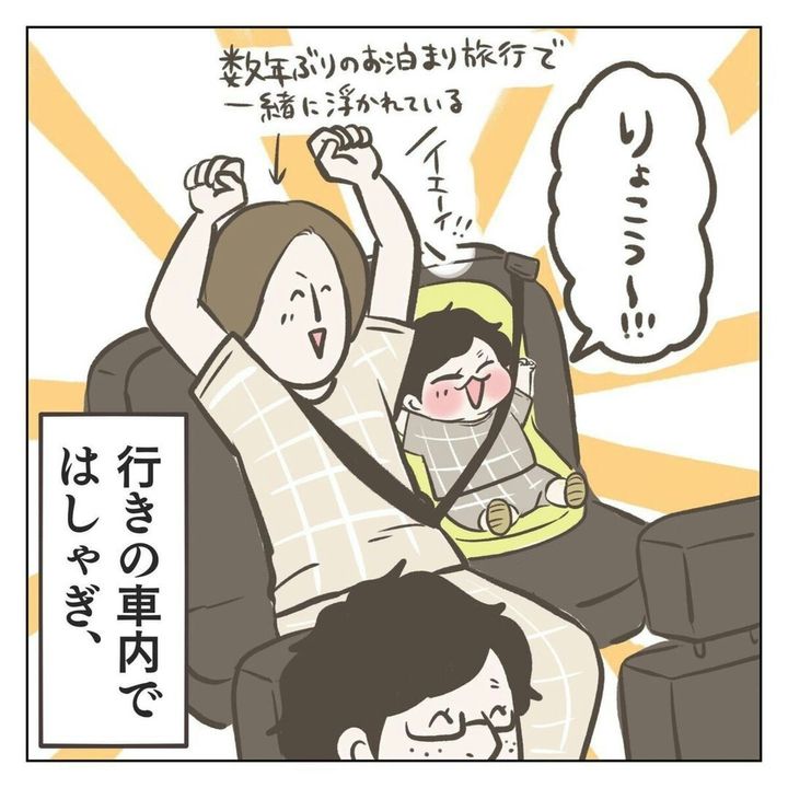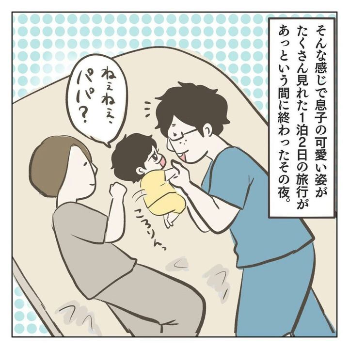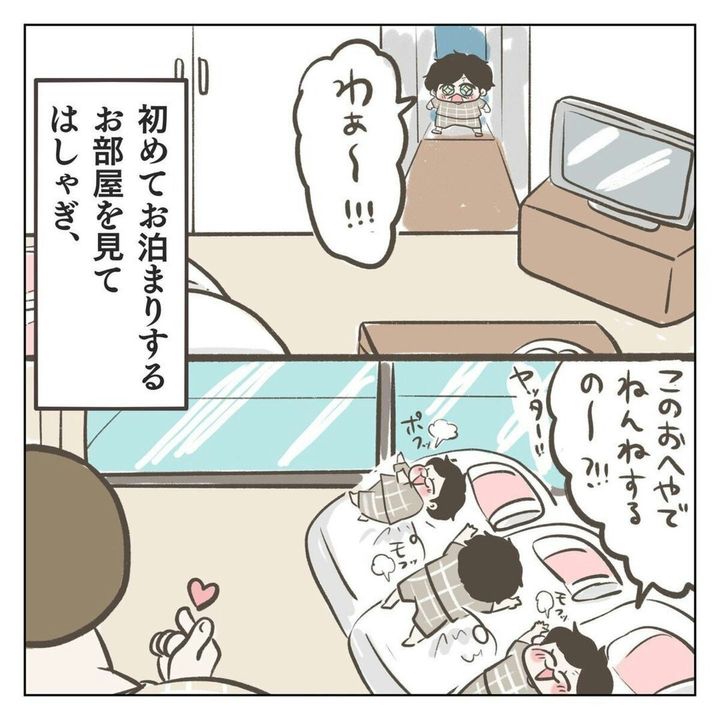 家族3人で初めてのお泊まり旅行に行ったジェーコ(@jeeeeeeeeko)さん。息子は行きの車から寝るまで終始ハイテンション。そんなかわいい息子の姿が見られてジェーコさんたちも大満足。さらに寝る直前、息子が夫に耳打ちで「しゅごいたのしかったね」と言うと…?