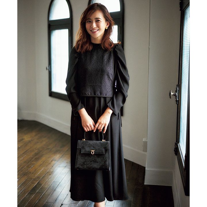 ワンピース¥42,900(トロワズィエムチャコ/アプレドゥマン)イヤリング¥5,250(アビステ)バッグ¥440,000(ロウナー ロンドン/エイチ アイ ティー)