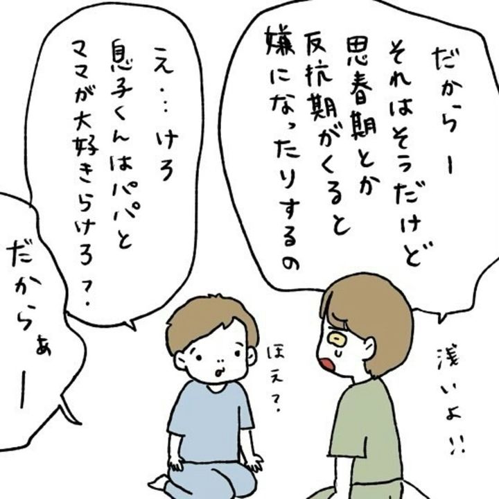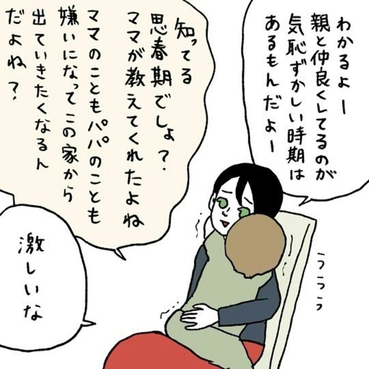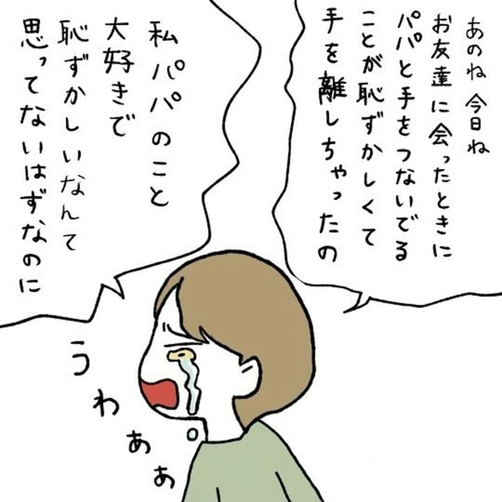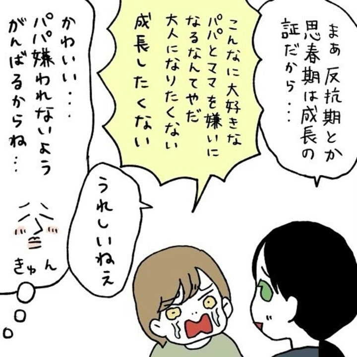 パパのことが大好きなのに、人の目を気にしてしまったことに大きなショックを受けるうにわさびさんの長女。自分で大人になっていく自覚をして、急に怖くなってしまったようです。「親のことが大好きだから思春期になりたくない」という長女の訴えは親としてとてもうれしいものでしょう。