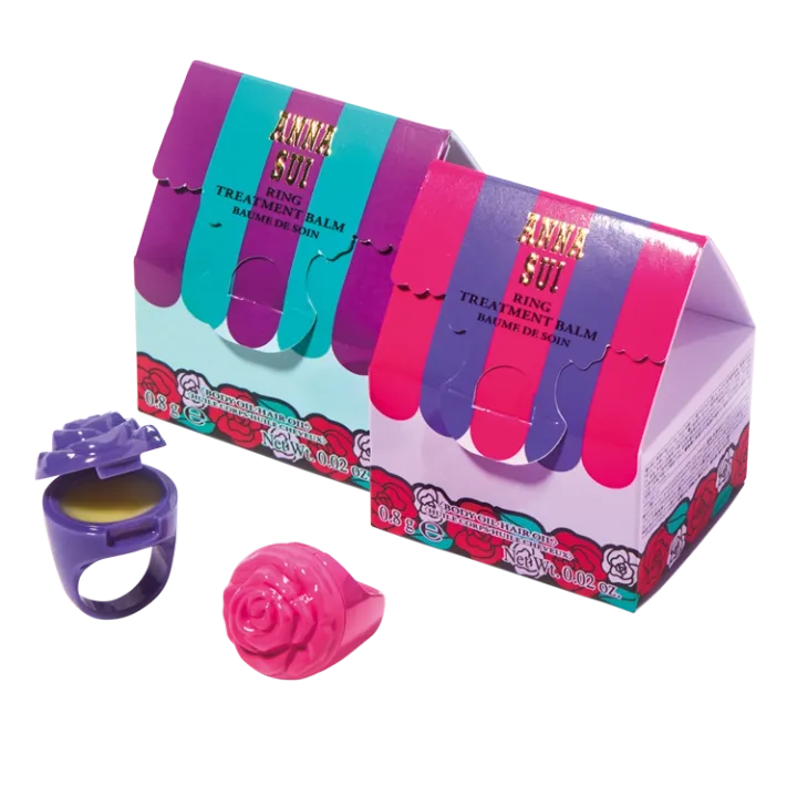 アナ スイらしいバラのリングを、パカッと開くと中には香りつきのバームがイン。ピンク(01)は上品なティーローズ、パープル(03)は甘酸っぱいレモンクリームの香り。