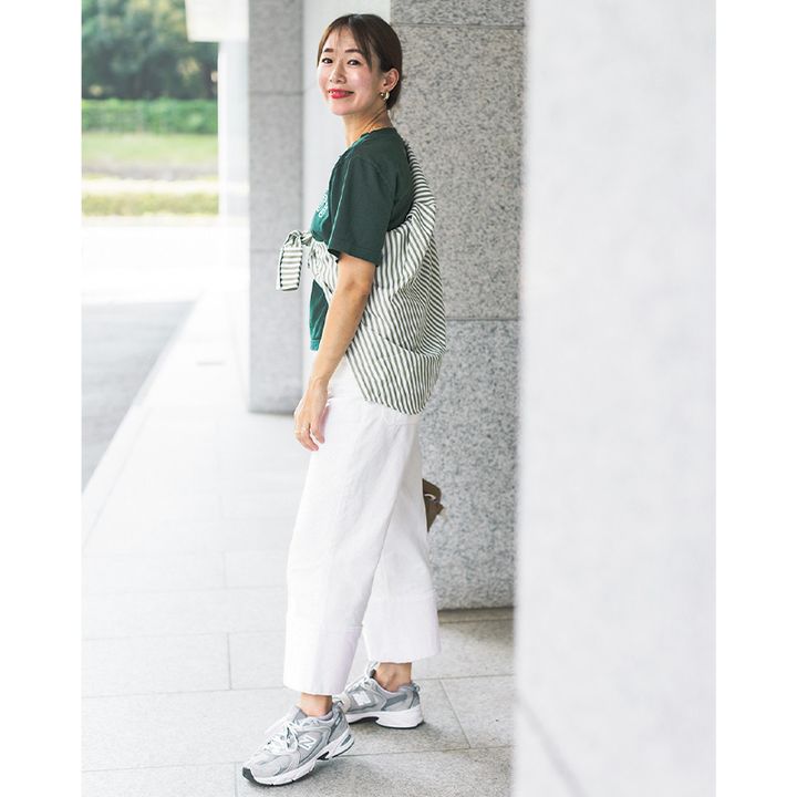 まだまだ薄着が続く9月こそ色を足して盛り上げたい!直球すぎないストライプならカラーONカラーも挑戦しやすく、カラーボトムスの気難しさをむしろ和らげてくれる効果も。羽織らずたすき掛けするだけで白Tの鮮度アップに成功。
