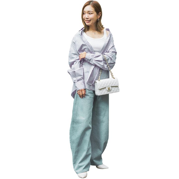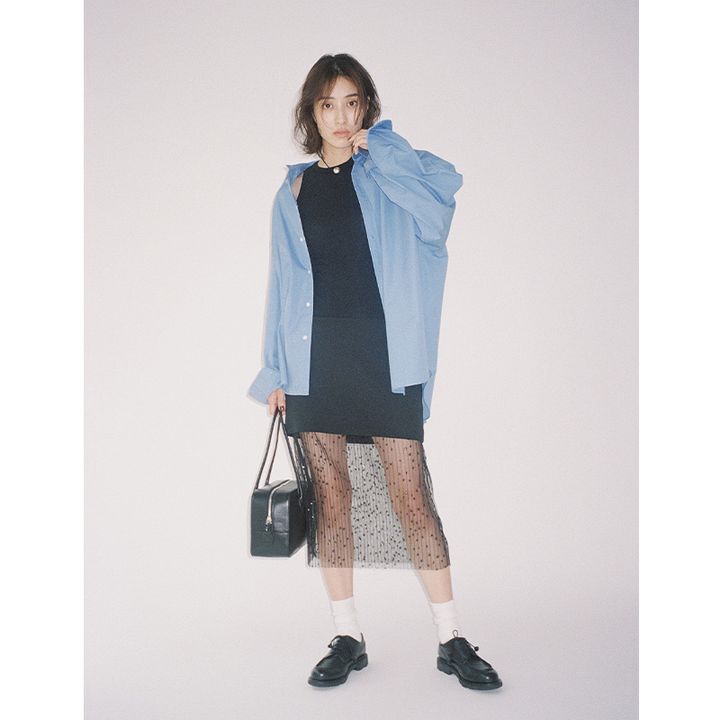 トレンドといえど無為には手を出せないミニは、安定・安心のブルーシャツで大人感を担保。ユニセックスならではの体の泳ぐぶかっと感で女っぽさを抑えてカジュアルに。