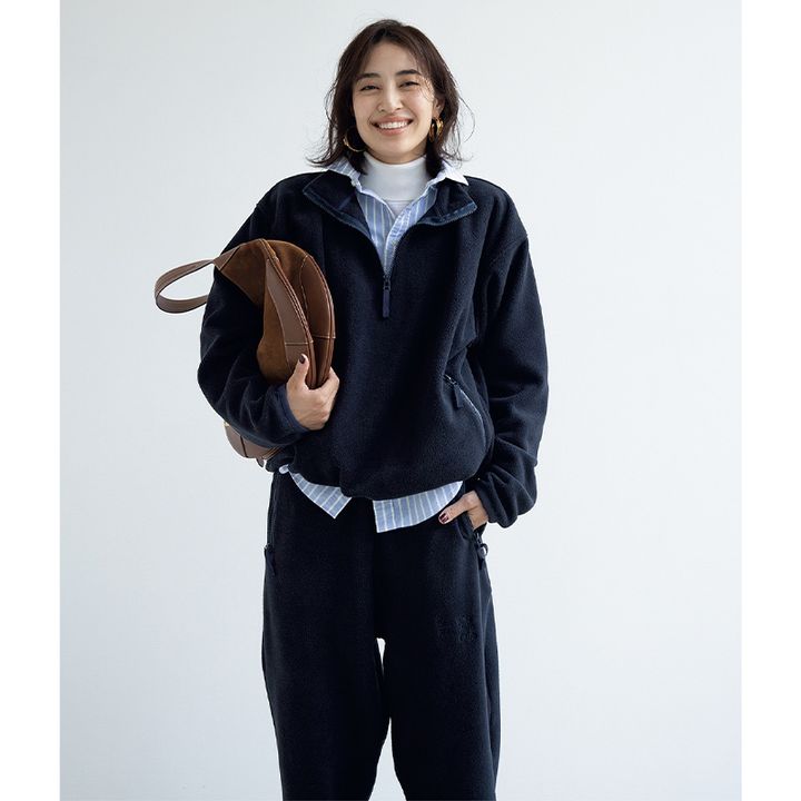 どう着ても品が良くなるポロのシャツはフリースをかぶせて、スポーティに寄せるのがアカ抜けの秘策。コージーなセットアップも重ね着のひと手間で手抜き感を払拭、ほどよくキレイに。
