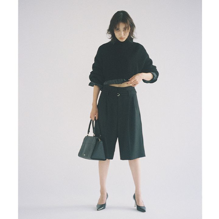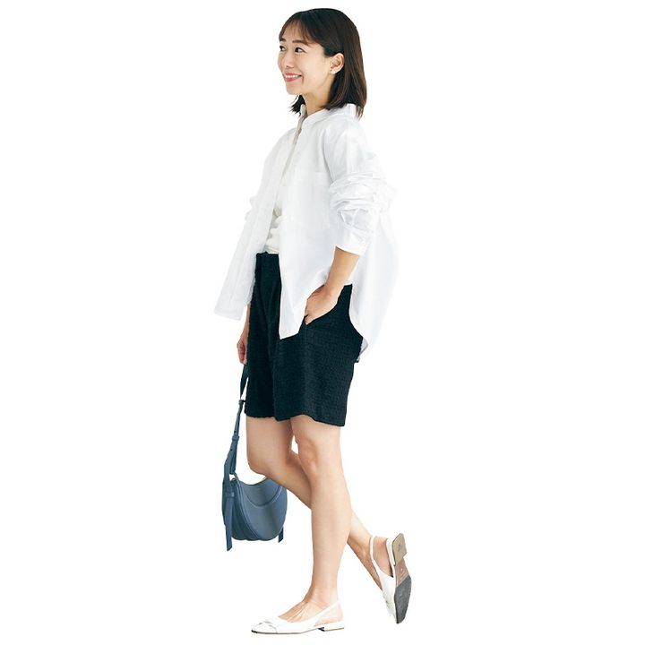 シャツ¥22,000(カルバンクライン ジーンズ/カルバン・クライン カスタマーサービス)ニット¥27,280(ステュディオ アール スリーサーティー)ショートパンツ¥26,400(イウエン マトフ/ユナイテッドアローズ 渋谷スクランブルスクエア店)バッグ¥46,200(ラシット/ラシット 西銀座店)パンプス¥32,000(ピッピシック)