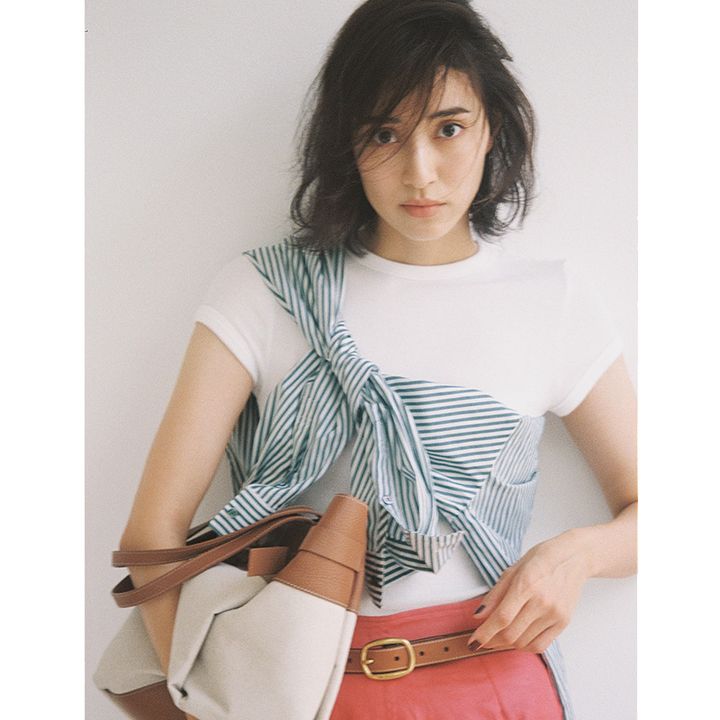 シャツ¥18,920(ネイヴ/オンワード樫山)Tシャツ¥13,200(ボーダーズ アット バルコニー)スカート¥17,600(ノーブル/ノーブル 有楽町マルイ店)ベルト¥30,800(ポロ ラルフ ローレン/ラルフ ローレン)バッグ¥60,500(イアクッチ/イアクッチ大丸東京店)