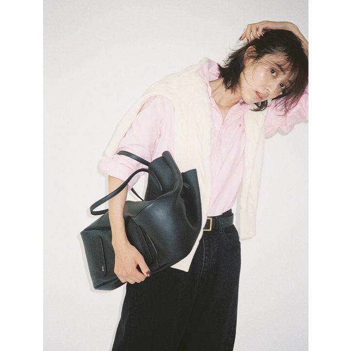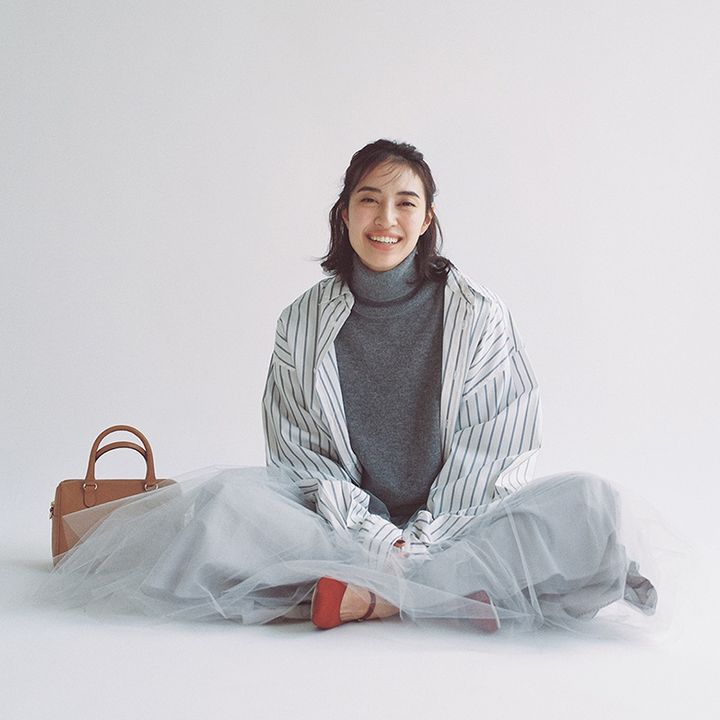 シャツ¥22,000バッグ¥119,900(ともにポロ ラルフ ローレン/ラルフ ローレン)トップス¥35,200中に着ているタートルニット¥31,900(ロエフ/エイチ ビューティ&ユース)パンツ¥28,600(すべてシー/エスストア)イヤリング¥74,800(コールムーン/ショールーム セッション)