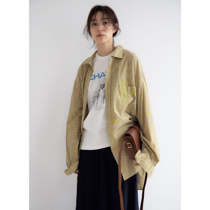 オタクっぽさが可愛いカラーチェックも注目株。ぶかぶかすぎるくらいのオーバーサイズを選んで“あえての適当さ”を強調。スタイリングの完成度を高めつつ、季節スライドにも成功。