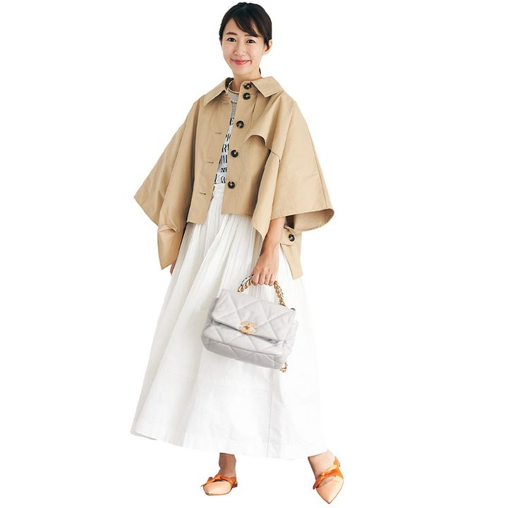 特徴的なシルエットが着映えるCOSのポンチョシャツは秋一番の戦利品。柔らかなベージュは好印象に寄せたい時に重宝しそう。短か丈だからスカート合わせが重たくならず、羽織るだけで一気に秋コーデにアップデートしてくれます。