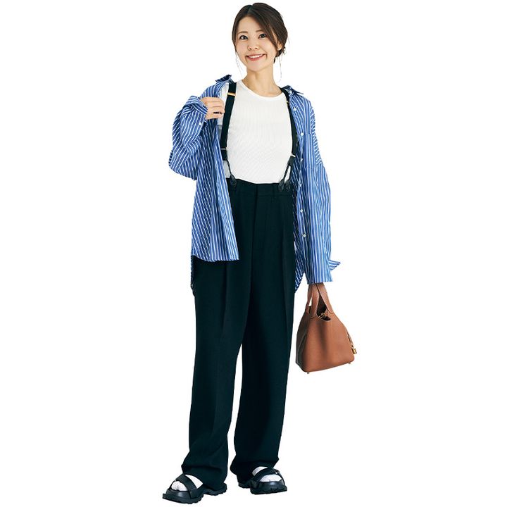 ミニマルにまとめるよりも、ストライプであえてガチャつかせることでモノトーンでも親しみやすく。立体感が出るのでワンツーよりスタイルアップにも一役。