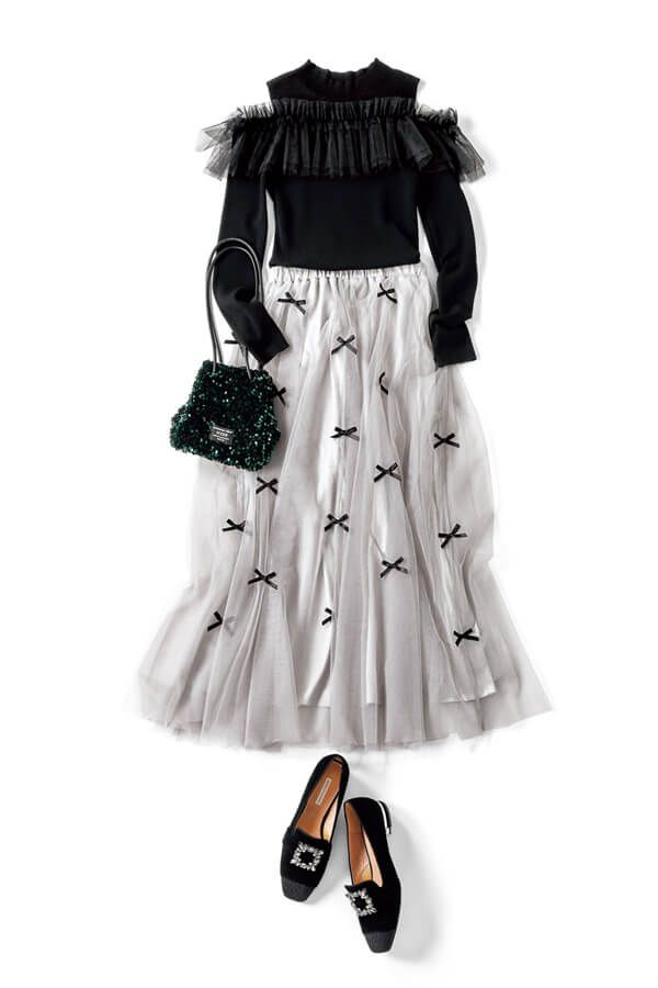 おしゃれに気合いが入る女子会には、ふわふわのチュール素材が大活躍♡ 全身をモノトーンでそろえれば、しっかり華やぎながらまとまりのある着こなしに。スパンコールバッグ&パンプスでスペシャル感もプラス。