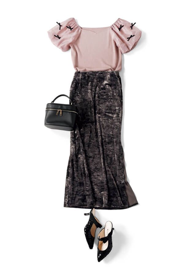パフスリーブにミニリボンをトッピングした、甘ニット。秋らしいベロア素材のタイトスカートを味方につければ、今っぽい甘辛コーデの完成! 小物は黒でまとめて統一感を。